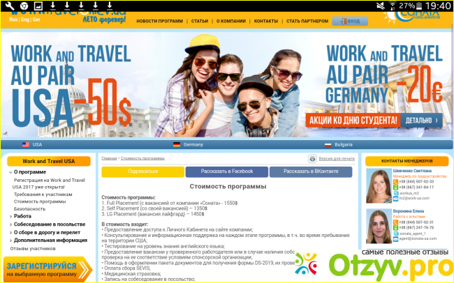 это студенческая ежегодная международная программа обмена, которая направлена на развитие культурного обмена между Украиной и США. Именно такое определение мы видим на официальном сайте этого проекта. Программа работает только для студентов дневной формы обучения, причем больше успеха у 23-24-летних "середнячков", а вот выпускники и первокурсники - это своего рода группа риска "возьмут-не-возьмут". В программе вы можете участвовать через посредников - агентства (как турагентства, только заточенные именно под эту программу). Американские спонсоры программы работают в основном именно с такими агентствами, очень непросто выйти на них самостоятельно. Будьте осторожны - в этой сфере немало мошенников, рекомендую воспользоваться услугами только тех агентств, которые указаны на официальном сайте проекта. Открыла сейчас их страницу - вся она пестрит предложениями от агентов компании "Соната".Официальный сайт дает нам следующую информацию о стоимости программы на 2017 год: