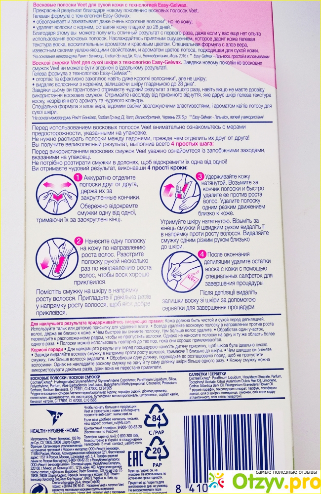Минусы: восковые полоски Veet стоят дорого, плохо удаляют волосы. Двух салфеток для удаления воска мало. После эпиляции появилось раздражение.