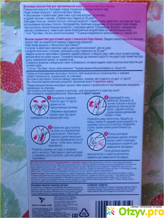 Согласитесь, что аромат так же немаловажен для женского восприятия продукта. Вот и я не оказалась исключением. Химией не пахнет совсем, будто и не воск держу, а ароматную конфетку, так бы и попробовала. Более же дешевые полоски пахнут откровенной химией и все желание ими пользоваться отпадает. 2. Воск. Воск гораздо гуще, чем у дешевых полосок. Да и на самой полоске его больше. Он не растекается и не скатывается в одно место на полоске, когда я ее отдергиваю, а значит и полоски хватит на дольше. 3. Салфетки завершения процедуры. Ну тут Вит несомненно выигрывает у своих конкурентов. Какие бы другие фирмы мне не попадались, у них какие-то непонятные крема в коробке, которые, причем, еще и после дня эпиляции несколько дней нужно будет мазать, чтобы был эффект. Да и раздражение никуда не пропадает. У Вит все не так. Салфеткой вполне достаточно воспользоваться сразу после процедуры и никаких неприятных для кожи последствий не будет. Да, Вит дороже, чем другие производители, но за качество и безопасность нужно платить.