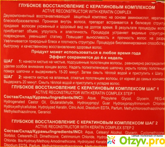Название на упаковке можно прочесть, если хоть немного понимаешь по-английски. Понятно, что в составе должен быть кератин, именно о нем идет в первую очередь речь, и подразумевает реконструкцию – восстановление. Что же мы имеем в итоге? Я открыла упаковку – в ней оказалось два средства, объемом по 200 мл, маловато как по мне для такой цены и моей шевелюры. Я думала, что мне даже для одноразового применения будет очень мало. Но я сильно ошиблась. Мне этого объема хватило на только на разовое покрытие, но и на три после этой процедуры. А значит на длинные локоны можно растянуть все это содержимое аж на 4 раза. А производитель говорит о 3-разовом. В общем, не лжет.