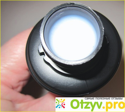 Содержимое флакона белого цвета имеет среднюю по густоте консистенцию.