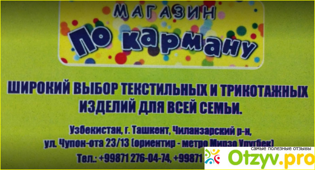 Не далеко от моего дома по адресу: Ташкент м. Чиланзар ул. Чупон-ота 23, расположен магазин: "По карману", я часто туда заглядываю, чтобы познакомиться с новинками ассортимента, выбрать одежду, и обновить свой гардероб.