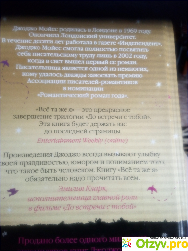 Книга мне понравилась, так как слог написания произведений у Джоджо Мойес очень лёгкий и интересный. Предложения простые, лаконичные и понятные.