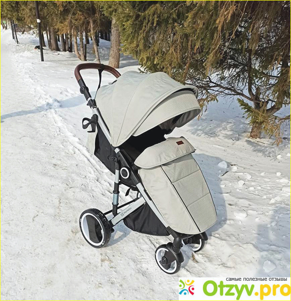 Колеса меня просто порадовали. Они крупные, крепкие, в подкачке не нуждаются, крутятся бесшумно. Снег у нас местами еще лежит, местами потаял, коляска одинаково легко проезжает и грязь, и утрамбованный снег. Передние колеса поворотные, вращаются на 360 градусов. Любые препятствия на пути объезжаем без труда. Так что проходимостью и маневренностью прогулки я довольна