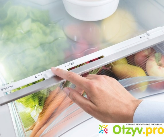 Очень удобным оказался и ящик для хранения овощей. В зависимости от того, какие в нем овощи и фрукты можно подрегулировать режим хранения. Точнее, регулируется уровень влажности, для того чтобы овощи и фрукты оставались свежими как можно дольше. На фото внизу виден ролик, который надо перемещать для создания наилучшего уровня влажности.