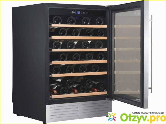 Винный шкаф Climadiff CLE51 высотой восемьдесят два сантиметра с тонированной стеклянной дверью отлично вписался в наш интерьер (площадь позволяет).