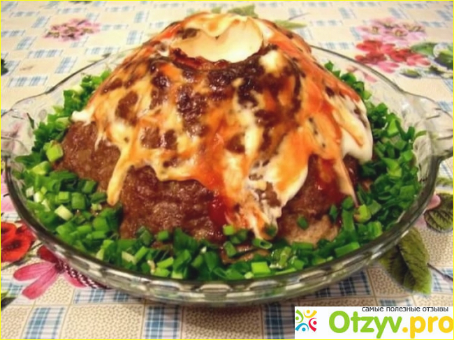 Когда фарш и картофель готовы начинаем собирать наш вулкан. Протвинь застилаем пергаментной бумагой и смазываем растительном маслом. Фарш выкладываем в центре горочкой и формируем как бы гору. Из картофельного пюре формируем небольшие лепешечки и этими лепешками обкладываем нашу гору-вулкан и также руками придаем нужную форму. Следующей слой вулкана выкладываем сырым фаршем. Из кетчупа создаем иллюзию стекающий лавы, от центра сверху и до низа. Сверху кетчупа наносим майонез и вилкой делаем волнообразные борозды. На верхушку вулкана кладем половинку яичной скорлупы, чтобы не потерялась форма при запекании. По кетчупу и майонезу посыпаем тертым сыром.
