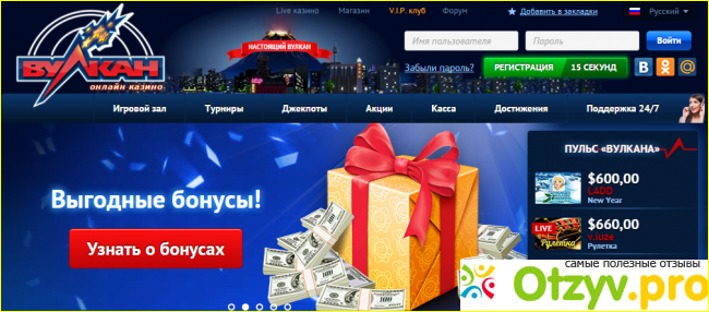 Начну с сайта - он довольно красочный, видно, что администрация проекта заплатила хорошие деньги за разработку и дизайн сайта, но вот что существенно раздражает, так это реклама, и однажды я просто занес себе на компьютер вирус и кое как его излечил. Второй момент - это отличная рекламная сеть, которая имеется у Вулкана. На какой крупный форум по заработку денег в интернете не загляни - везде реклама Вулкана, к тому же на своем ресурсе они постоянно размещают объявления о бонусах и вот недавно я видел на сайте, что при первом депозите вам дается бонус в размере 300 долларов. Конечно же это из области фантастики. Довольно живо пытаются владельцы проекта набрать и раздвинуть свою массу пользователей, завлекая их новыми акциями и конкурсами. Также довольно часто проводятся различные турниры с определенным депозитом.
