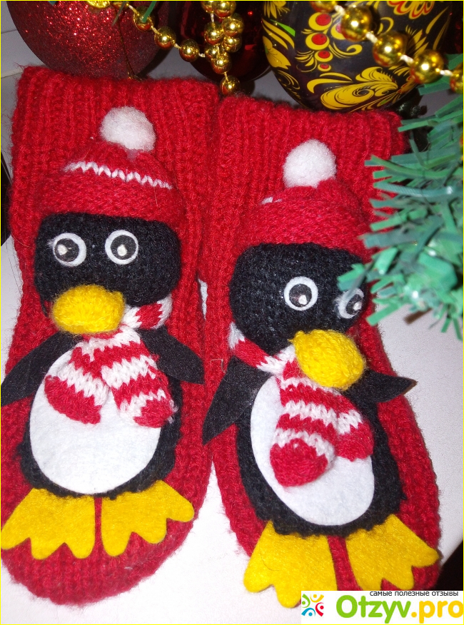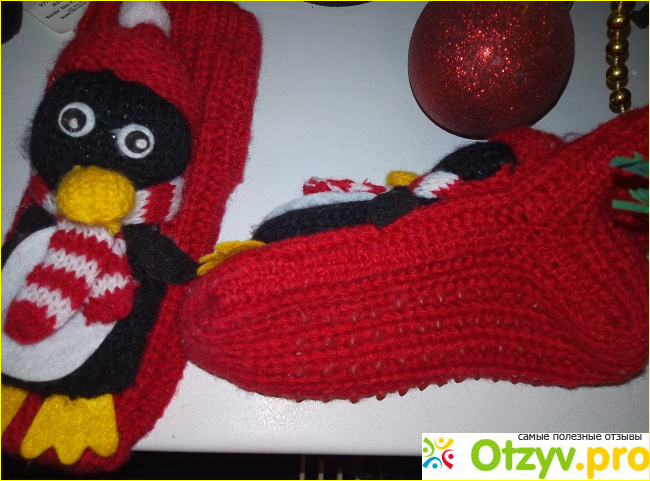 На красных вязанных носочках, производитель добавил мягкого пингвина. В виде игрушки, пришитой к каждому индивидуально носку.