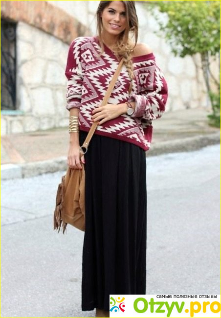 Хотите получить эффектный образ. Сочетайте орнаментный узор укороченного изделия на одно плечо с длинной юбкой в пол. Не забудьте об аксессуарах - крупные браслеты, ремешки, подвесы.