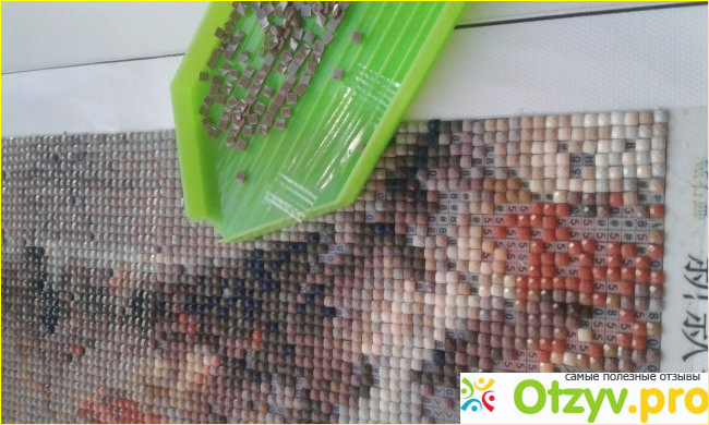 Кто-то высыпает несколько цветов сразу в емкость для алмазов, кто-то – выкладывает по одному цвету. Я скажу, что когда картина идет разноцветная, то можно выкладывать сразу несколько цветов (главное – запомнить условное обозачение тонов). Я же обычно высыпаю полный пакетик алмазов одного тона и выкладываю один цвет, пока он у меня не закончится (здесь сложность состоит в том, чтобы в огромном количестве условных обозначений на картине найти «свой» тон – а это не всегда бывает просто. Часто случается, что многие ячейки упускаются по невнимательности – приходится многократно возвращаться к одному цвету, но в условиях огромного количества алмазов одного цвета, но разных тонов, такой способ для меня предпочтительнее).