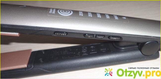 На верхней пластине посередине находтся датчик, защищающий волосы от перегрева. Он автоматически определяет необходимую для волос температуру в зависимости от их толщины, влажности и т. д. Конечно, можно самостоятельно установить любую температуру. Я, например, предпочитаю выпрямлять волосы при температуре 200 градусов.