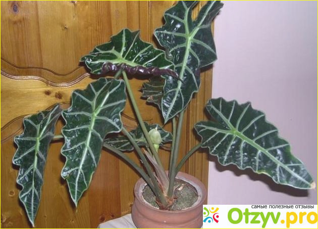 Но так как у нас квартира расположена близко к заводам и еще главная магистраль здесь же находится, то в доме все время плохой воздух, то захотелось завести пару растений к себе домой, но только не цветущих, а именно лиственных, чтобы растения убирали всю гадость в доме, всю пыль и так далее. При этом хотелось, чтобы растение было красивым, не требовало много ухода за собой. Долго искала тот самый цветок, мне посоветовала обратить внимание на алоказию. Вообще очень интересное растение, я его покупала за 400 рублей небольшой росток, чем больше продается растение и чем оно старше, тем и ценовая категория на него будет больше, но зато в плане ухода он можно сказать, что совсем не прихотливый.
