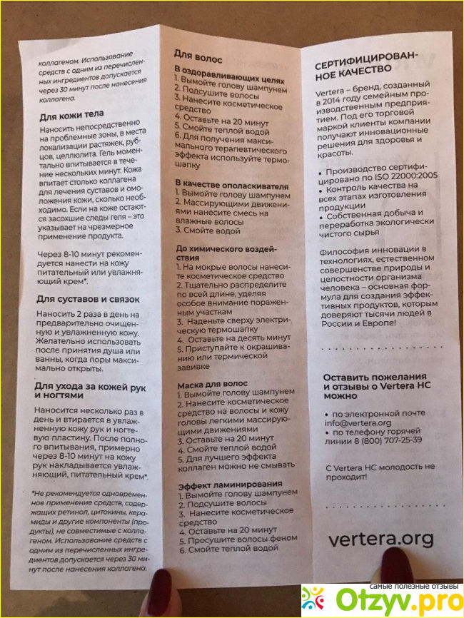 В целом, я очень довольна результатом использования высокомолекулярного нативного коллагена Vertera HC. Он действительно улучшает состояние кожи и волос, делает их более здоровыми и красивыми. Я рекомендую его всем, кто хочет улучшить свою внешность и поддерживать здоровье своих суставов и связок.