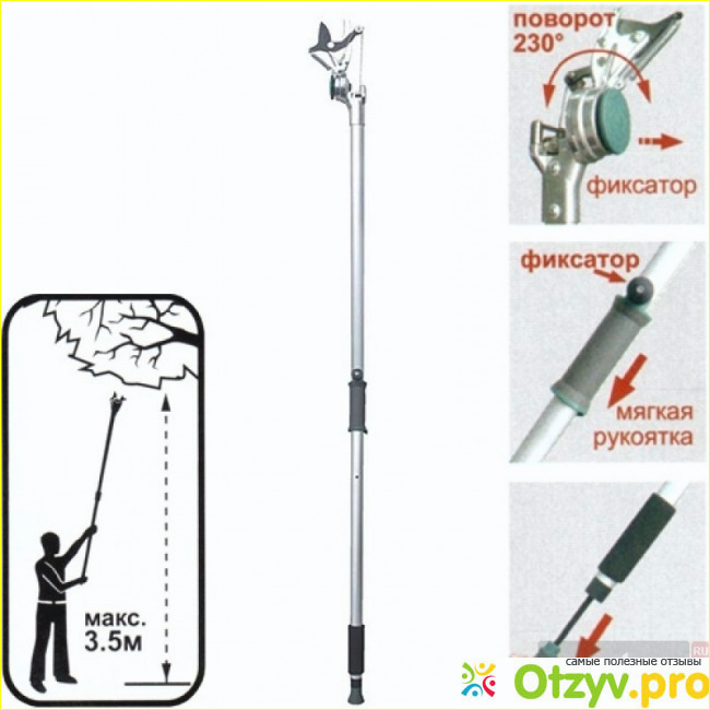 Сам стержень сделан их алюминия, который очень прочный и легкий, поэтому он устойчив в различным изгибам и он отлично защищен от возможной коррозии, поэтому высоторез обеспечит вам долгую службу. Благодаря мягкой рукоятке, которая изготовлена из резины, высоторез удобно будет держать в руке, он не будет соскальзывать. Благодаря удобному обхвату рукоятки, вы сможете достаточно удобно и легко работать с этим инструментом в саду. Также инструмент оснащен специальным механизмом, благодаря которому обеспечивается еще дополнительное удобство, так как во время обрезки, очень важен поворотный механизм, и благодаря этому вы сможете работать даже в тех местах, где очень трудно и невозможно просто так подобраться.