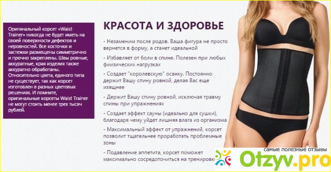 На сайте покупателям предоставляется подробное описание корсета для коррекции фигуры. Здесь продавец полностью наводить всю технологи похудения с помощью такой вещи. Оказывается, что корсет предназначен для проведения спортивных тренировок. Он как бы помогает улучшить качество тренировочки благодаря своему удерживающему эффекту.