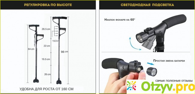 Тросточка помогает полностью обслуживать себя самостоятельно, не зависеть от посторонней помощи. Подходит мужчинам и женщинам. Есть возможность регулировать остов по высоте, подстраивая под рост хозяина. Еще одна неимоверная деталь – подсветка дороги, чтобы избежать спотыкания и падения в темноте.
