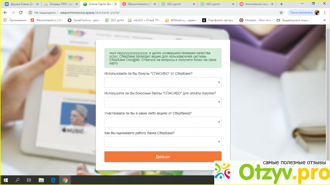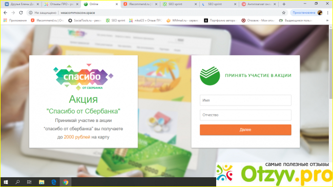 Сайт позиционирует себя, как раздающий бонусы "Спасибо" от Сбербанка. Если присмотреться внимательно, то можно понять в чем здесь обман.