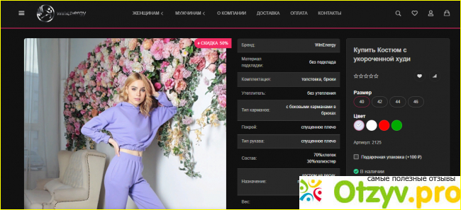 Мне понравился магазин во всех отношениях. Заказала себе по акции стильный костюм с укороченным худи в красивом лавандовом оттенке. Качеством осталась полностью довольна, отлично держит форму и не требует какого-то особенного "замороченного ухода".