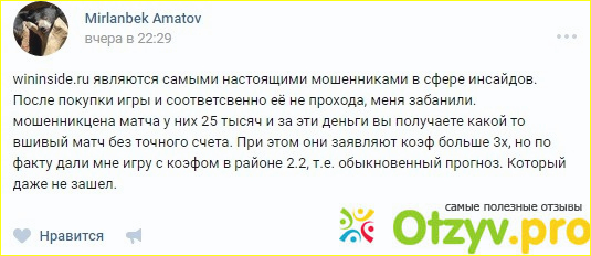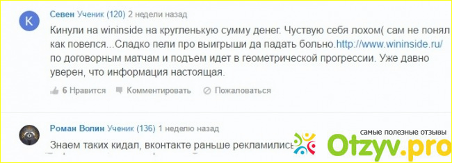 Добрый день, уважаемый читатель моего отзыва. Сегодня я хочу с вами поговорить о таком ресурсе как WininSide. Даже по сути объяснять нечего, достаточно лишь вбить в ютуб и вы сразу поймете, что это настоящие мошенники, которые предлагают вам заработать на договорных матчах.