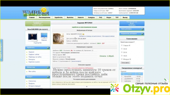Сайт мне нравится своей простотой, я там легко ориентируюсь. Могу посмотреть свои личные сведения, свои ссылки, пригласить друзей, по желанию, кто хочет немного заработать. А также работать социальными сетями. Кто желает раскрутить себя и свои идеи тоже могут воспользоваться сайтом и за свои деньги размещать задания для выполнения пользователями.