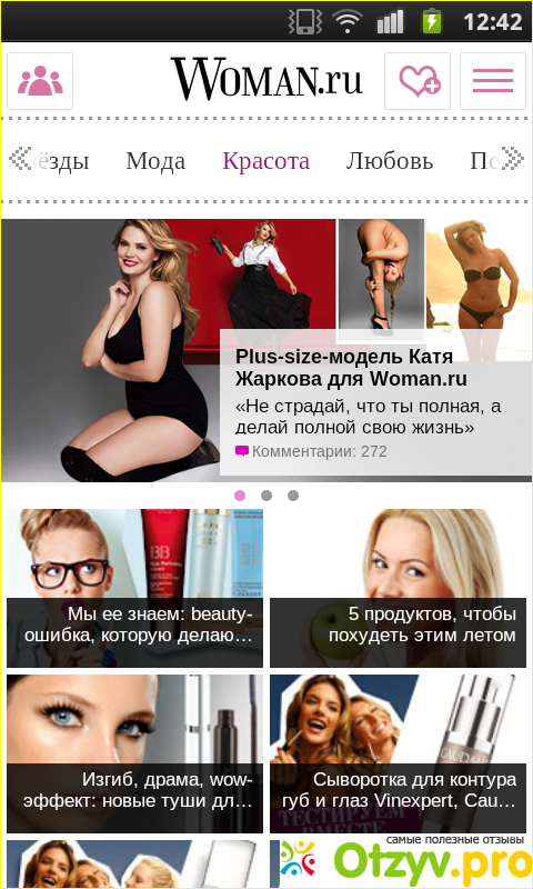 Woman.ru позиционирует себя, как женский журнал. Зайдя на главную страничку сайта, человек прежде всего попадает на новости о звездах шоубтзнеса. Что примечательно, под каждой новостью есть возможность оставлять комментарии, делиться мнениями о том или ином событии. Но одними новостями Woman.ru не ограничивается. Статей на этом сайте существует великое множество — выбирай на свой вкус! Все они разделены по категориям: Звезды, Мода, Красота, Любовь, Психология, Диеты, Здоровье, Дети, Жизнь, Дом. Сайт отличается крайне удобной навигацией. К примеру, в разделе «Звезды» можно выбрать пункт «Энциклопедия звезд», где по алфавиту расположены имена или фамилии звезд, новости о которых можно найти на данном сайте.
