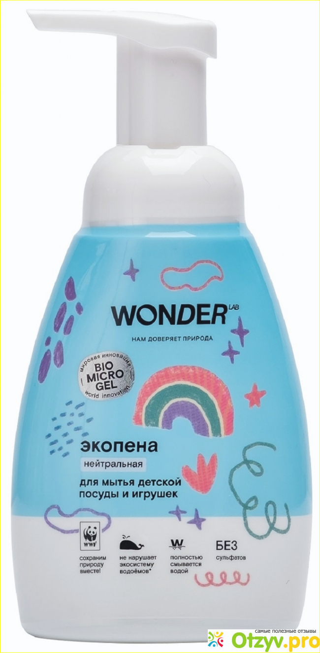 Кроме этого хотелось бы, чтобы он справлялся с загрязнениями. Одно из таких экологичных, экономичных, безопасных и качественных средств я нашла у бренда Wonder Lab - это ЭКОПЕНА. В ее составе натуральные биомикрогели, созданные из яблок, свеклы и кукурузы. Для меня такая пенка в диковинку. Раньше для мытья посуды использовала только гели, а пенкой, оказалось, тоже приятно пользоваться. Очень понравился дизайн бутылочки и его содержимое. У нее достаточно крепкий и мощный дозатор, который хорошо вспенивает средство. Пена выходит густая и плотная. Объем у флакона небольшой 240 мл, но расходуется экономично, пенку на губке обновляю не часто. Да мою ей только детскую посуду. Перчатки при мытье не использую – пена не стягивает и не сушит кожу. Хороший продукт, на который стоит обратить внимание, всем мамочкам, заботящихся о здоровье своих детей.