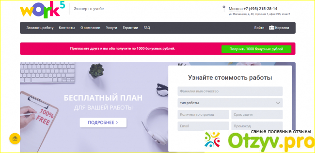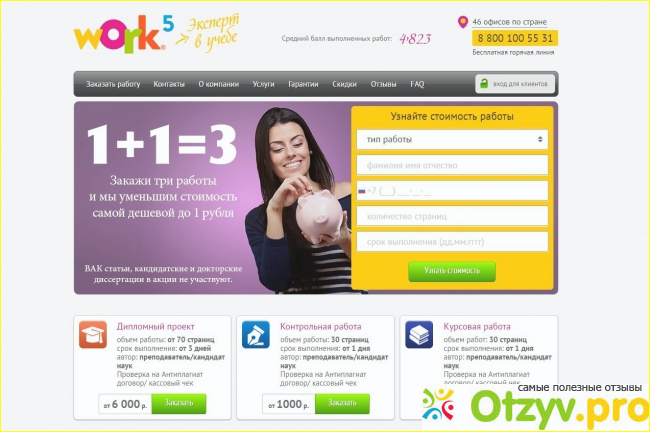 В качестве сервиса для заказа курсовых работ сайт work5 можно использовать, но если нужна по-настоящему качественная работа, например дипломная, лучше её здесь не заказывать. Качество работ могут оценить на 3, но при этом ценник немного ниже среднего. Не могу сказать, что я доволен сайтом на все 100% поэтому не буду рекомендовать его.