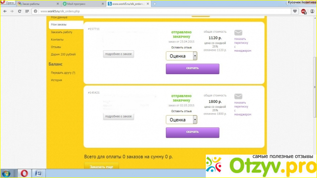 После оплаты указанной части заказа, он передается исполнителю. Когда работа будет полностью готова приходит соответствующее сообщение. Для получения ссылки для скачивания выполненной курсовой необходимо перевести оставшуюся часть стоимости заказа. Если в течение небольшого промежутка времени оплаты не поступило, как было в моем случае, сразу звонят сотрудники сервиса и настойчиво просят оплатить выполненную работу в полном объеме. Такая настойчивость немного достает, ведь клиент всегда прав и заставлять его нервничать не нужно. Работа мне была действительно нужна, поэтому я оплатил оставшуюся часть суммы. Вариантов оплаты предусмотрено много, поэтому каждый сможет сделать это удобным для себя способом, среди самых популярных: банковская карта, вебмани, яндекс деньги.