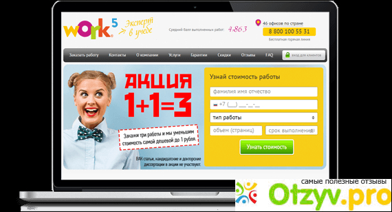 На сайте сведения очень завышенные с первой фразы, которая звучит, что work 5 лидирующая компания по выполнению научных и дипломных работ в нашей стране России. Сейчас огромное число компаний, которые за деньги выполнит Вам любые работы, главное, чтобы предпочтения пали на них.