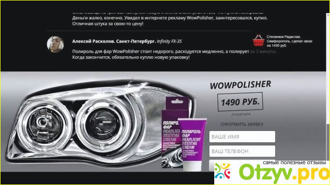 А ночных поездок по работе у меня достаточно много. Поэтому я на мытье фар денег не жалела. Одна моя знакомая посоветовала мне WowPolisher полироль для фар. Рассказала, что она им пользуется уже пол года. И он отлично помогает.