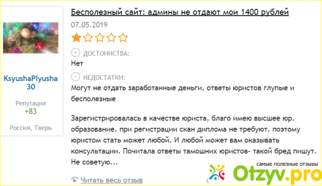 Он рассказал мне, что на 9111.ru регистрация бесплатная, консультация тоже. И тут я подумала, почему бы мне тоже не попробовать зарегистрироваться. Прошла форму регистрации, потом узнала, что это и необязательно было делать. Потому, что если вы хотите задать свой вопрос по телефону, то на сайте указан номер телефона , куда можно обратиться. А если вы хотите в личном кабинете задать юристам вопросы, это уже вопрос другой. Какие плюсы у 9111.ru? За консультации вы не заплатите не копейки. Согласитесь, что не все знаю свои права и обязанности, а на этом сайте есть возможность, что вас осведомят. Ответ не нужно долго ждать. 10-15 минут и вам тут же перезванивают! В личные сообщения тоже приходят письма с ответами. Мне этот сайт нравится. Всегда приятно , когда грамотные специалисты могут направить в нужное русло, рассказать, подсказать. Хочу выразить за это им большую благодарность. Настоящие молодцы! Рекомендую!
