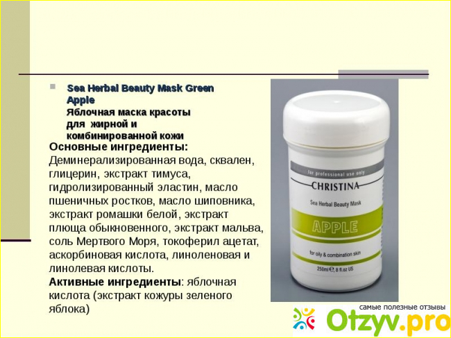 Яблочная маска красоты Christina Sea Herbal Beauty Mask Green Apple идеально решает проблему жирной и комбинированной кожи, потому что работает на выравнивание образования жира, устраняет жирный блеск, блокирует размножение бактерий и образование от них прыщей, подкожной сыпи.