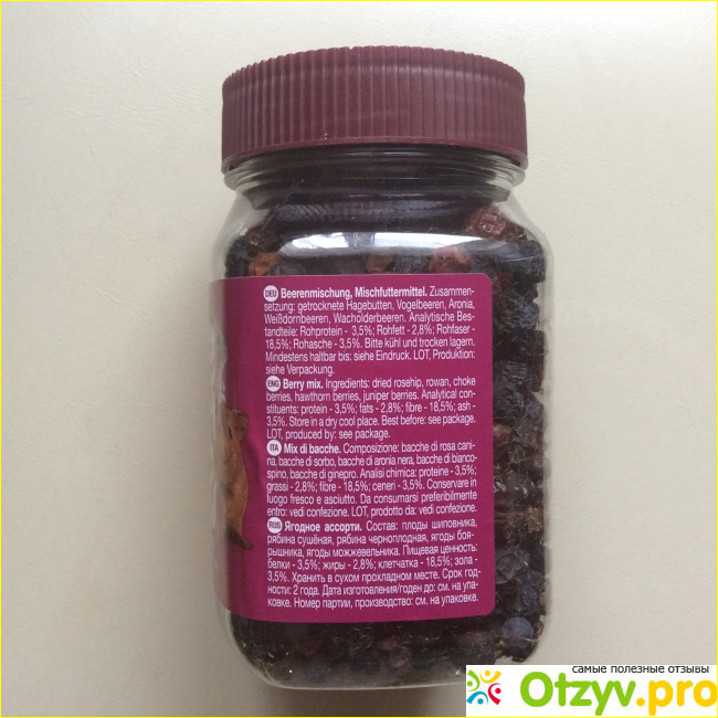 На упаковке производитель разместил информацию, которая обязательно пригодится любому заводчику грызунов. В первую очередь нужно знакомиться с составом, в который входят только самые полезные натуральные ягоды. Все эти ягоды разрешены грызунам, что я проверяла благодаря надёжным источникам. Также на упаковке можно найти информацию о хранении, рекомендации производителя по выдаваемой суточной норме. Честно говоря, я не совсем согласна с суточной нормой смеси, выдаваемой животному. По его словам небольшому зверьку необходимо потреблять одну чайную ложку в сутки. У нас крыса среднего размера, поэтому по своему опыту скажу, что одна чайная ложка в сутки таких ягод для него очень много и столько он никогда не съест.