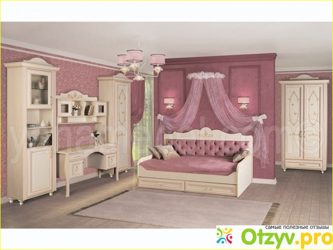Жаль, что пока у нас нет возможности отвести отдельную комнату для ребенка. Но я с удовольствием рассмотрела все варианты. Они очень разнообразные, подойдут и порадуют, как мальчиков, так и маленьких принцесс. Я не случайно назвала девочек принцессами, ведь есть вариант, который, иначе, как вариантом для принцессы не назовет. Это касается и цветовой гаммы, и формы всех деталей. В комплект входит красивый диван, шкафчики отделаны фигурной фурнитурой и симпатичными рисунками. На мебели изображены цветы и бабочки