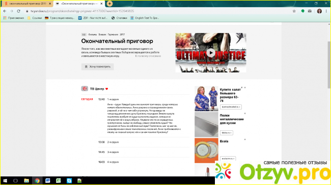 Яндекс телепрограмма была бы всем хороша (бесплатная, удобная в использовании, с подробным описанием передач), если бы не одно существенное НО. Зачастую в описании к одному и тому же фильму даётся несколько совершенно разных аннотаций, относящихся к разным фильмам, которые вводят в заблуждение зрителя. К примеру, 28.03.2020 в 12:40 по телеканалу ТВ Центр должен демонстрироваться фильм "Окончательный приговор".