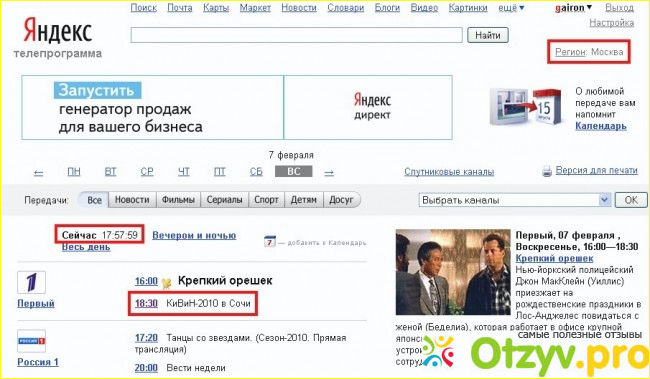 - на главной странице отображается то, что идет в данный момент на основных каналах;
