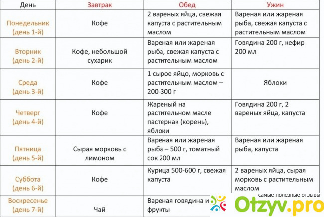 Итак, меню рассчитано на 14 дней и каждый день хоть немного, но отличается от предыдущего. Все дни чередуются, то есть за две недели у вас будет по 2 одинаковых дня. Первый и тринадцатый дни одинаковые: на завтрак нужно выпить всего лишь кофе без молока и сахара. На обед- два вареных яйца, вареную капусту и выпить стакан томатного сока, можно заменить чаем. На ужин- 200 грамм вареной или жареной без масла рыбы. Второй день и двенадцатый: завтрак - кусочек хлеба и кофе без сахара, обед- рыба и вареная капуста с растительным маслом, ужин- 100 грамм вареной говядины и стакан кефира. На третий день и одиннадцатый завтрак такой же как и во второй, хлеб можно подсушить в тостере. На обед- жареные кабачки в любом количестве. Ужин как и во второй день. Четвертый и десятый дни: на завтрак выпить чашку зелёного чая или кофе, с сухариком или тостом; на обед съесть жареный на растительном масле кабачок; ужин – съесть салат из любой капусты, можно заправить маслом, 200 г варёной говядины и 2 яйца вкрутую. День пятый и девятый достаточно легкие: на завтрак – салат из одной моркови, заправленный лимонным соком; обед – 250-300 г варёной или жареной рыбы, стакан томатного сока; на ужин –любые фрукты, кроме банана и винограда. Шестой день и 8: завтрак – чашка зелёного чая или кофе; обед – вощной салат из свежей капусты или из сырой моркови, 300-400 г варёной курицы; на ужин – 2 яйца вкрутую и салат из одной сырой морковки, приправленный растительным (любым) маслом. Диета достаточно не простая, но эффективная.
