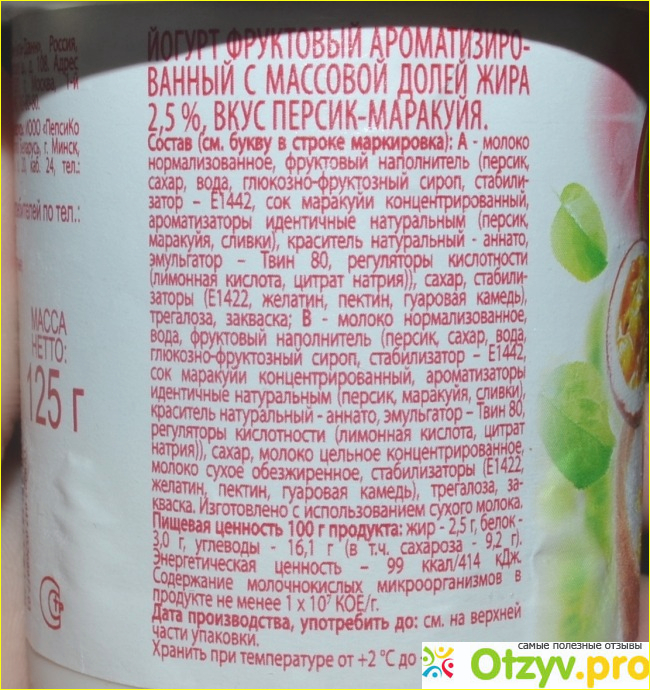 Теперь подумаем о названии, производитель честно сказал , что этот йогурт ароматизованный персик - маракуйа, тоесть там вообще не присутствуют эти фрукты, только их ароматизаторы, что , как-бы, не очень радует, свидетильствует только о наявности различных ароматизаторов и отсутствие натуральных фруктов в даной продукции.
