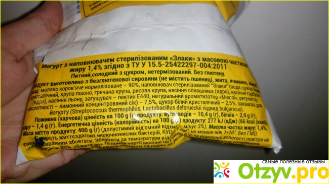 Йогурт не очень жирный, его жирность всего 1,4%, но благодаря содержанию злаков доволи сытный.