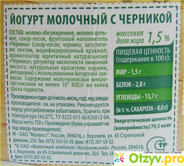 Состав, как заявляет производитель, натуральный, что в принципе так и есть: загустители и консерванты имеют природное происхождение и даже полезны, присутствуют настоящие ягоды (в случае со злаковым «Вкуснотеево» - зерновые хлопья). Единственное, что смущает это ароматизаторы, без которых йогурт был бы не хуже, и большое количество сахара.