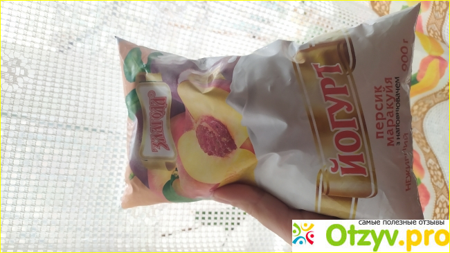 Состав йогурта не совсем уж идеальный, но достойный как для вас йогурта. Изготовлен йогурт из коровьего молока, без добавления пальмового масла. Наполнитель в йогурте натуральный, но с ароматизатором в придачу. Пюре из персика и сок маракуйи натуральный, и даже маленькие кусочки фруктов попадаются. Йогурт ароматный, вмеру сладкий. Цвет слегка желтоватый, и это благодаря натуральному красителю бета-каротину и аннато. Фруктовый вкус йогурта напоминает о лете, и сразу улучшается настроение.