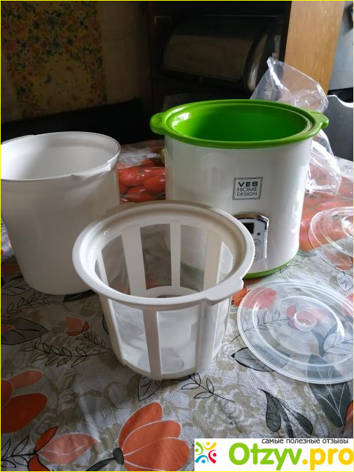 В комплекте с прибором есть еще дополнительные элементы. Сначала не поняла для чего они, но все таки необходимо прочитать инструкцию полностью перед тем, как начинать первую работу. Остальные элементы необходимы для того, чтобы продукт, который вы готовите, не застаивался. Не важно , что вы решили приготовить, в любом случае будет получаться сыворотка и сгусток. Есть продукты, где сыворотка очень хорошо видна и с продуктом она составляет одно целое. Но, при необходимости всегда можно ее отделить при помощи ситечка.