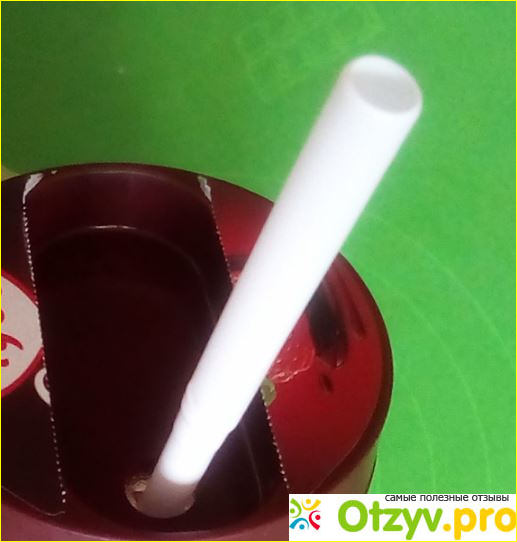 Оригинальна крышечка. На ней производитель обещает нам изысканный сливочный вкус. Трубочка спрятана в специальное углубление в крышке. Нужно снять полоску этикетки, под которой обозначена дырочка для трубочки. Трубочка белого цвета, находится в сложенном виде, после извлечения ее можно вытянуть до нужной длины.
