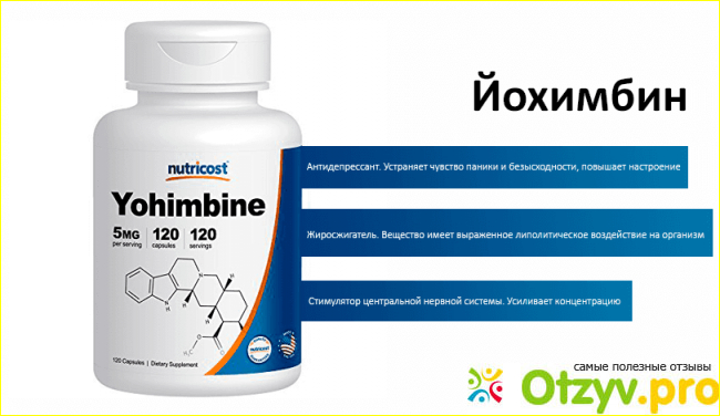 Действие Йохимбина направлено на стимуляцию ЦНС, выступает он в качестве антидепрессанта, соответственно хорошо повышает настроение.