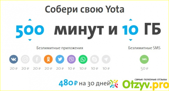 Теперь поговорим о преимуществах Yota и первое, что мы отметим, это широкие возможности настройки параметров под себя. Когда мы говорим "под себя", то имеем в виду, что каждый пользователь выбирает необходимое количество Гигов интернета и минут для звонков. Но и это не все. Пользователь может сделать пользование всеми мобильными приложениями безлимитным! И всего за каких-то 20-30 рублей!