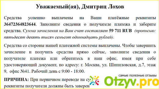 Ей сообщили, что финансы уже готовы к отправке, но нужно подтвердить свою личность. Это можно сделать по адресу фирмы или введя все данные на сайте и разместив скан паспорта. На самом завершающем этапе сообщается, что для верификации карты с нее спишут небольшую сумму (1%) от выплаты. После подтверждения личности эта сумма вместе с платежом вернется на карту обратно.