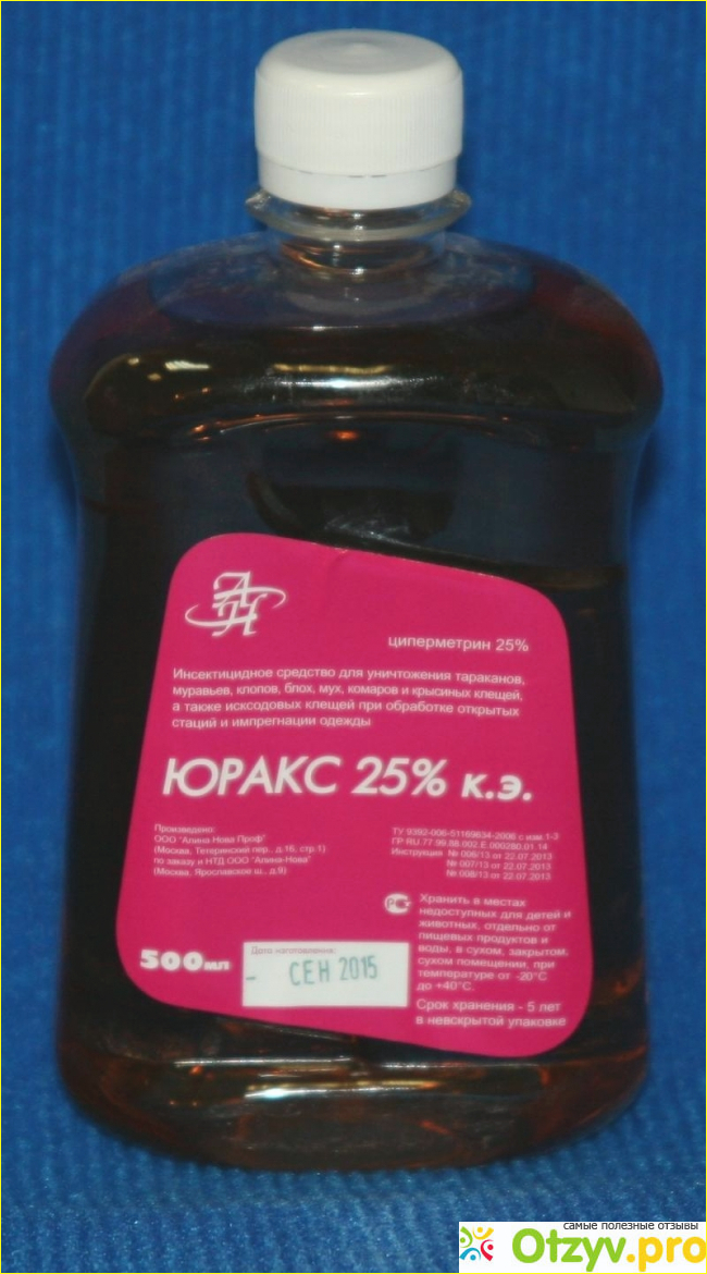 Юракс представляет собой особую эмульсию для уничтожения клопов, которую нужно предварительно разбавить водой. Это очень концентрированные средство, его нужно совсем немного. Основным компонентом Юракса является вещество циперметрин. Сама эмульсия прозрачного цвета с красным оттенком. Большим плюсом является тот факт, что приготовленную смесь можно хранить достаточно долгое время, при этом она сохранит свои свойства. А вот цвет её может поменяться на жёлтый или коричневый. Но все -таки лучше использовать ею после приготовления.