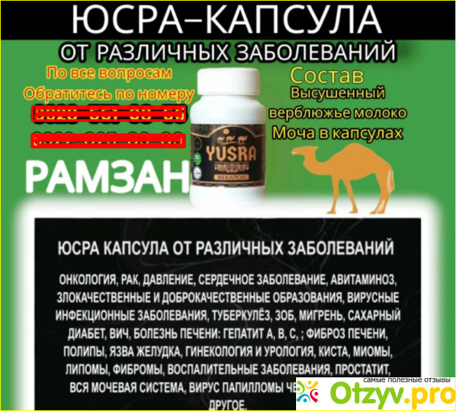 Не так давно я узнала о капсулах Yusra (Юсра), которые были представлены как универсальное средство от всех проблем. Привлекла меня их реклама с обещаниями быстрого выздоровления и многообещающий подход. Но меня несколько насторожил их состав, включающий сублимированную верблюжью… мочу и сублимированное верблюжье молоко.