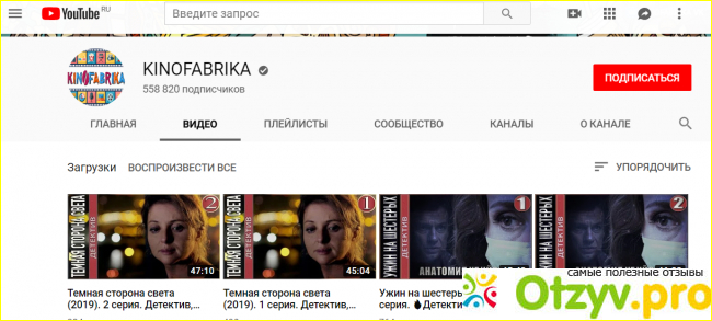 Однажды на Ютубе я наткнулась на канал "Кинофабрика". Я посмотрела на нем один сериал, другой. Теперь, когда у меня возникает желание посмотреть какой-нибудь фильм я сразу захожу в Ютуб на канал "Кинофабрика".